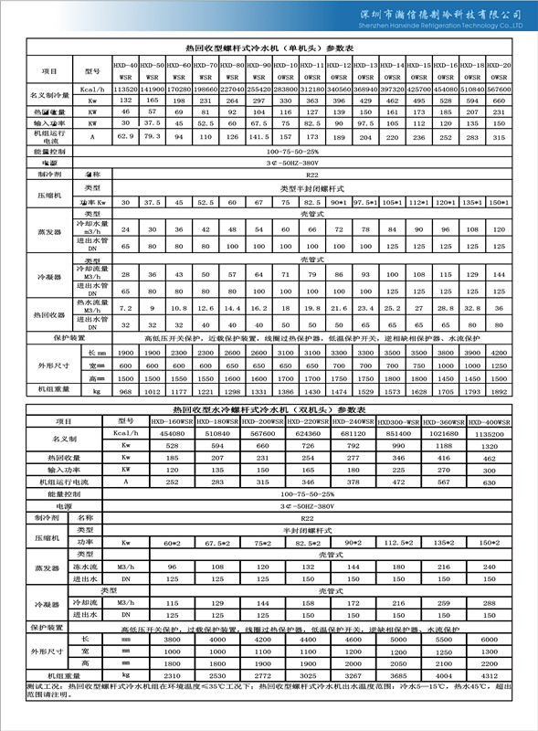 熱回收冷水機組分為:水冷螺桿式和風冷螺桿式熱回收冷水機組兩種,又名熱回收型螺桿式制冷機,水冷式需要配合冷卻塔使用,制冷效率高于風冷式,但風冷式有安裝方便的優點,因此它們各有所長,廣大用戶朋友可根據自己的實際情況選用適合自己的熱回收冷水機組。如果您不知道應該怎么選用,可致電我們技術工程師咨詢!